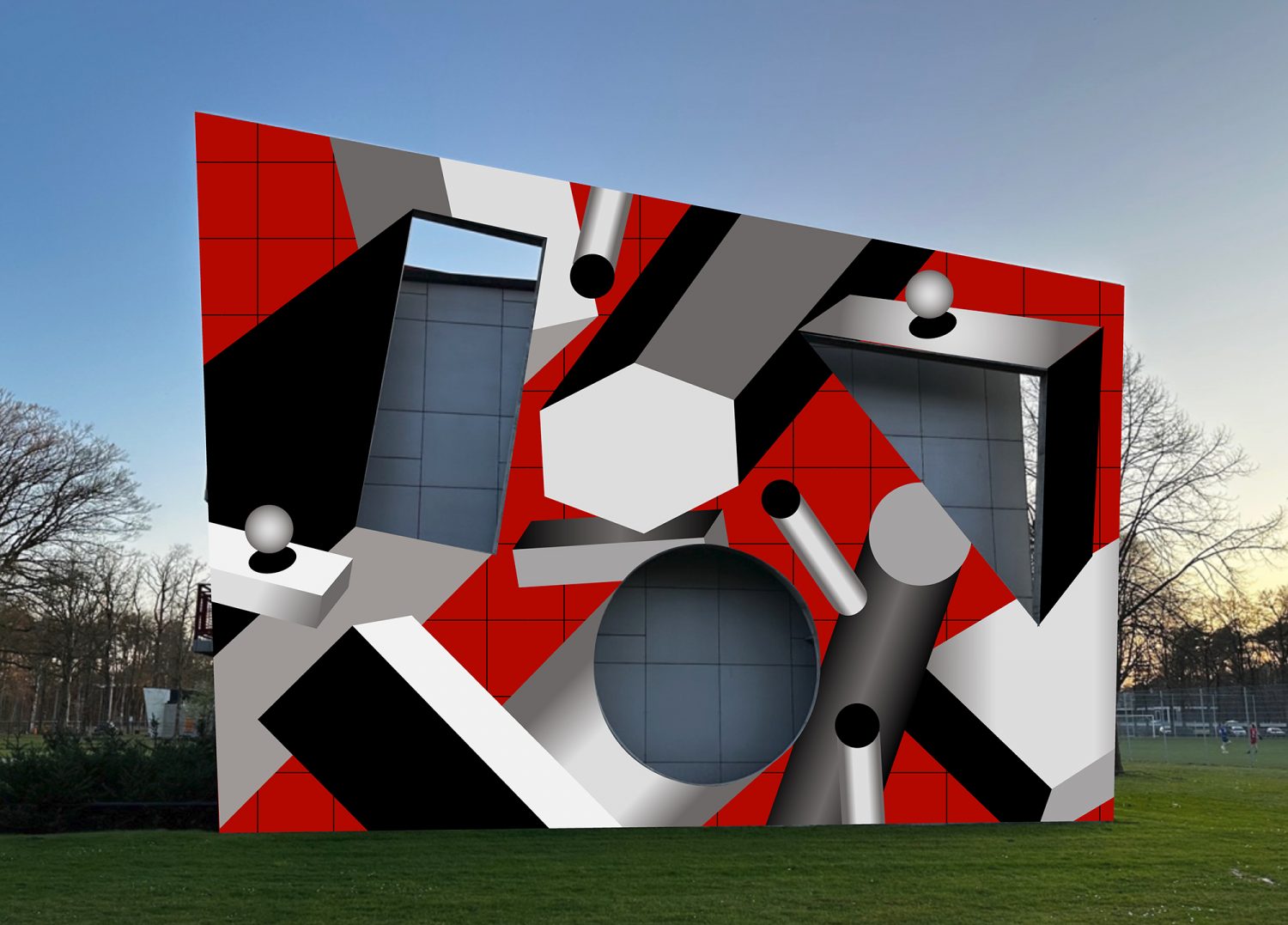 Die Einflüsse reichen von der Strenge der De-Stijl-Bewegung über die experimentelle Farb- und Formensprache der Memphis-Gruppe bis zu den ikonischen Strukturen früher Videospielgrafiken. In dieser Verbindung entsteht eine formale Sprache, die gleichzeitig retrofuturistisch und konzeptuell ist – ein Spiel mit kollektiver Erinnerung, medialer Oberfläche und räumlicher Wahrnehmung.